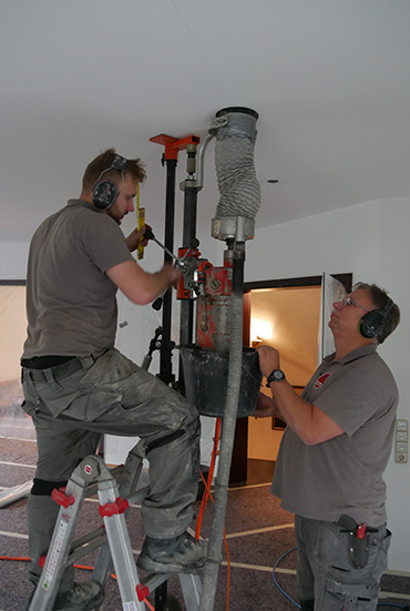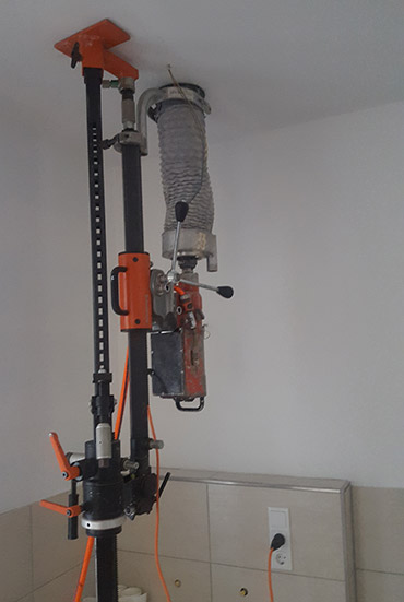 Für den nachträglichen Einbau von z.B. LED-Leuchtkörper in Decken ist eine passende Kernbohrung zu erstellen. Mittels eines speziellen Kernbohrständers, der zwischen Decke und Fußboden gespannt wird, ist dies befestigungslos (ohne Dübel) möglich. Gleichzeitig wird das für die Kernbohrung benötigte Kühlwasser direkt im Flex-Rohr abgesaugt. Verunreinigungen können so weitgehend vermieden werden. Nach Entfernen des Bohrkerns kann also der Elektriker seine LED Beleuchtung setzen. Die elektrische Leitungsführung kann von oben oder mittels Schlitz erfolgen.