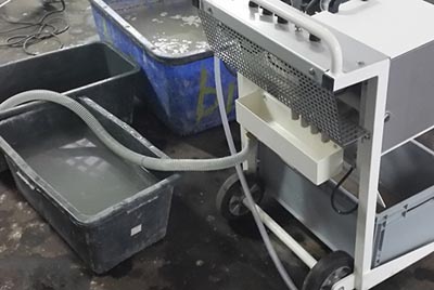 Seit Mai 2011 können wir mit einer modernen Schlammpresse, das anfallende Bohr- und Schneidewasser auch vor Ort aufbereiten. Das physikalisch gereinigte Wasser ist so sauber, dass es frei über jeden Abwasserkanal entsorgt werden kann.
