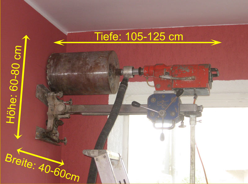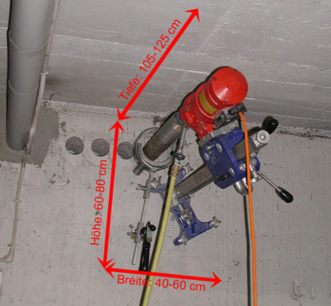 Auf den unten dargestellten beiden Fotos sehen Sie den benötigten Platzbedarf für die Erstellung von Kernbohrungen. In der Regel ist eine Höhe von 60 - 80 cm, Breite von 40 - 60 cm und eine Tiefe von 105 - 125 cm erforderlich.