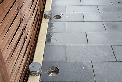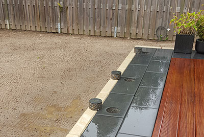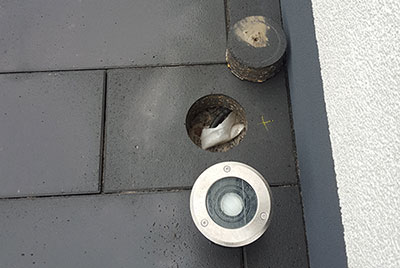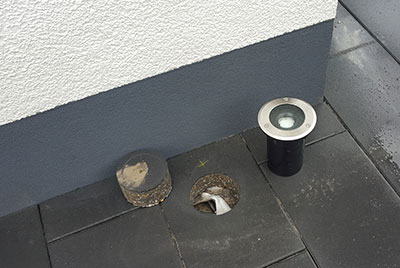 Die folgenden Bilder zeigen ein Beispiel wie mittels Kernbohrungen eine bodenbündige LED-Außenbeleuchtung realisiert werden kann. Bei der Neugestaltung des Gartens wurde eine neue Terrasse, ein Carport sowie die Auffahrt zum Haus mit Steinplatten neu ausgestattet. Die Kernbohrungen wurden in den fertig verlegten Steinplatten vor Ort in Abstimmung mit dem Elektriker, der die benötigten Stromleitungen verlegte, abgestimmt und ausgeführt.
